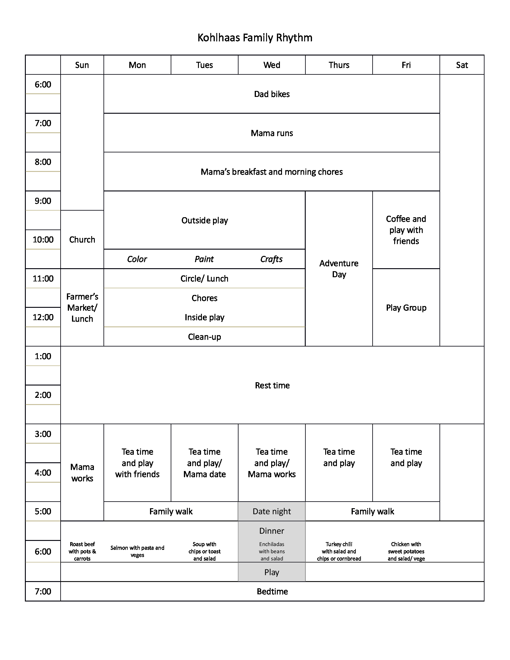 Make a list of the different aspects that you would like to see incorporated into your family rhythm. For example, time outside everyday, time with friends, exercise/ sports, work, etc… Now make a chart with the days of the week and times of day. Write out what happens each week which you want/ need to occur, but you have little control over the timing. For instance, your work, your partner’s work, your child’s school/ daycare, other extracurricular classes, playgroups, naptimes, bedtimes, mealtimes, etc. Of course, in the end, nothing is in stone. But, it is good to start with what we believe must happen at a certain time.
